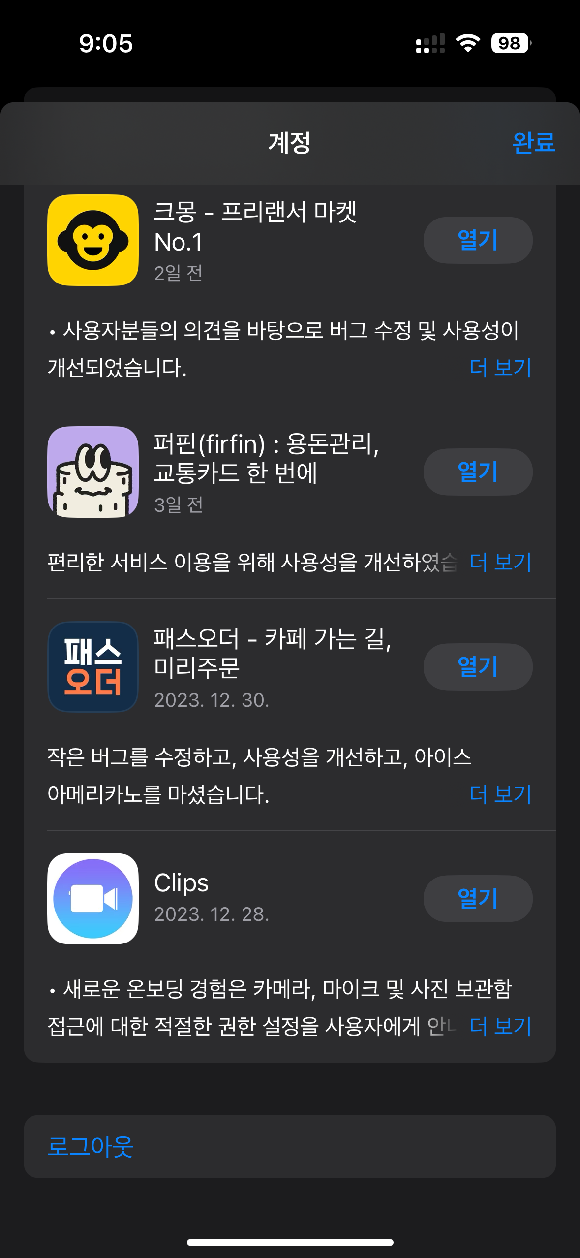 9. AppStore 상단 자기 프로필 아이콘을 클릭하면 계정항목으로 들어가고 화면 가장 하단에 "로그아웃"이 있습니다. 로그아웃을 누르고 화면 상단으로 이동하면 기존 자기 아이디가 표시되던 자리이에 "Apple ID로 로그인"이 표시됩니다.