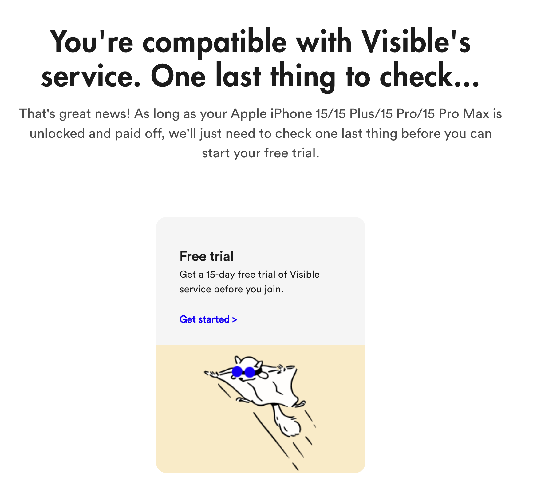 5. 특별한 문제가 없으면 아래와 같이 가능하다는 화면이 표시되고 Free trial의 조건이 나오고 Get started가 표시됩니다.