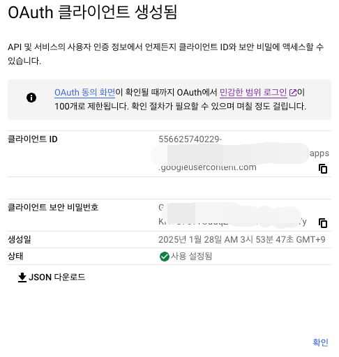 정상적이면 아래와 같이 OAuth 클라이언트가 생성이 된다. 여기에서 생성된 "클라이언트 ID"와 클라이언트 보인 비밀번호는 외부 유출이 되지 않도록 잘 관리해야 한다.