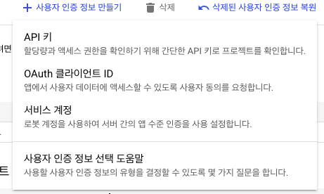 중간에 "사용자 인증 정보 만들기"란 파란 메뉴가 있다 클릭하면 아래와 같은 메뉴에서 "OAuth 클라이언트 ID"를 선택해서 생성을 시작한다.